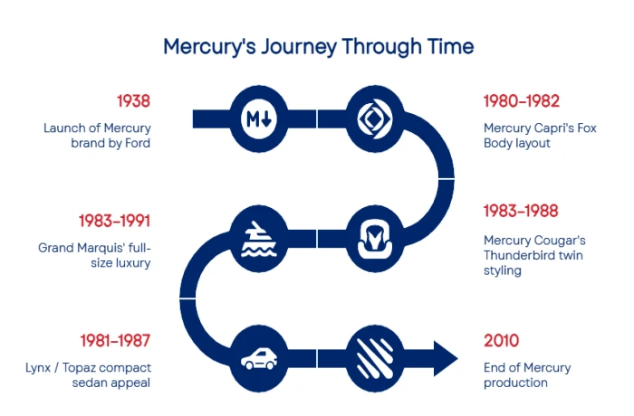 Mercury was a division of Ford Motor Company, launched in 1938 to bridge the gap between Ford and Lincoln. It focused on mid-level luxury and performance vehicles.