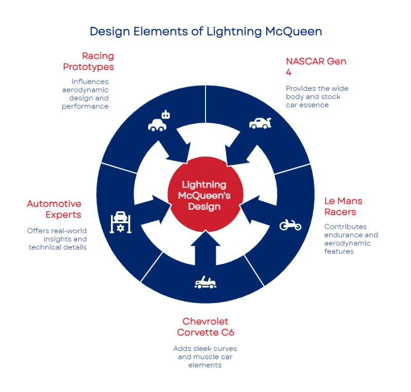 Lightning McQueen isn’t modeled after just one vehicle. He’s a custom blend of race car legends that includes NASCAR Gen 4 stock cars, Le Mans endurance racers, and the Chevrolet Corvette C6. That combination gave him a wide body, low stance, and sleek curves built for speed.